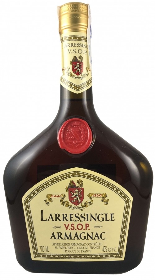 ARMAGNAC LARRESSINGLE VSOP este lasat la maturat in butoaie de stejar, pentru a-si contura aromele fine si onctuase. Acest Armagnac este suplu, complex și fructat, cu note de prune si un finisaj lung si intens.