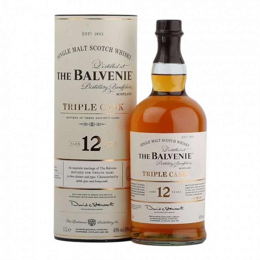 Balvenie 12 ani din gama Triple Cask este realizată din whisky maturizat în trei tipuri diferite de butoaie, È™i anume butoaie de stejar american de primă umplutură, butoaie tradiÈ›ionale de reumplere È™i butoaie Oloroso. În urma maturizării, Balvenie 12 ani Triple Cask creeaza o expresie coezivă È™i aromată, încărcată cu fructe de livadă È™i condimente de scorÈ›iÈ™oară.