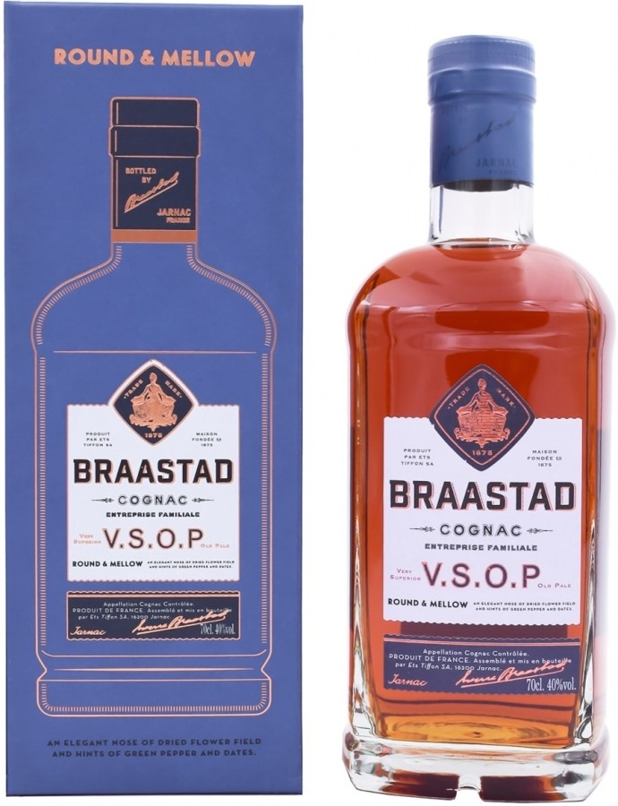 BRAASTAD VSOP este un amestec de cognacuri selectate special, din regiunea Fins Bois. Timpul de maturare ridicat ofera bauturii o aroma armonioasa si opulenta.