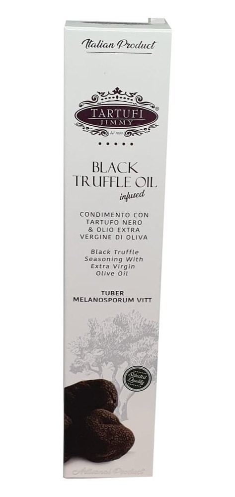 Descopera Uleiul cu Trufe Negre Tartufi Jimmy – un condiment rafinat, nascut din fuziunea dintre uleiul de masline extravirgin si infuzia delicata de trufe negre Tuber melanosporum, intr-un raport atent calibrat: 99% ulei si aprox. 0,2% trufa uscata.