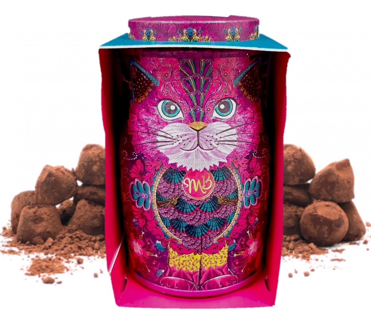 Descopera un mic moment de magie cu Persian Pink Mini Cat de la Monty Bojangles – o cutie adorabila, in forma de pisica roz, care ascunde in interior trufe fine, pudrate cu cacao, cu o textura catifelata si un gust intens de ciocolata care se topesc in gura.