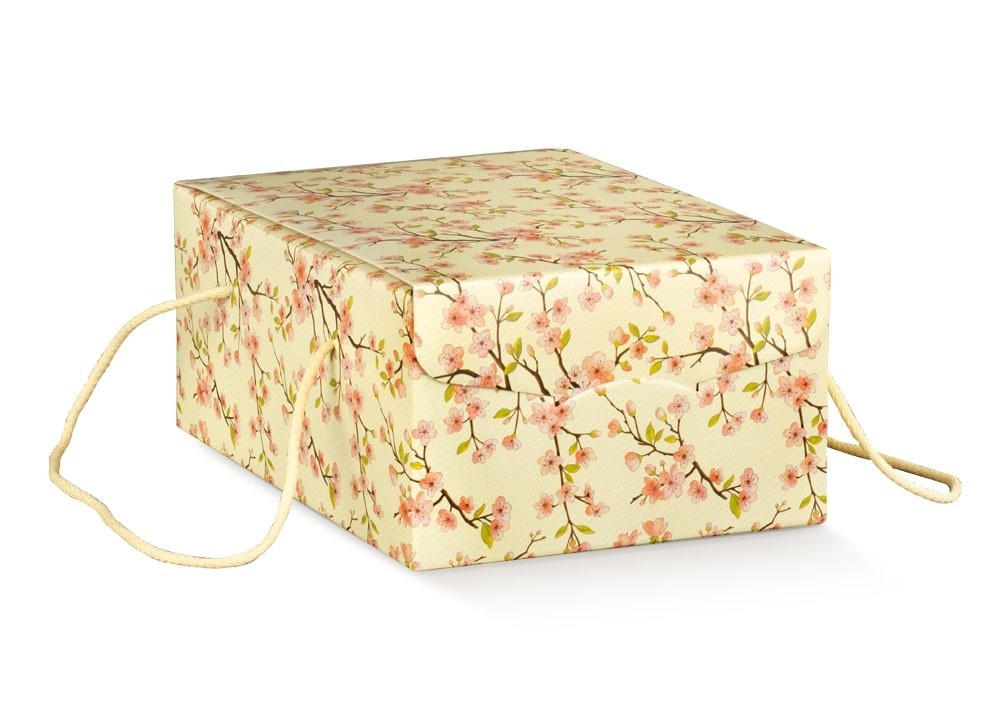 O cutie perfecta pentru orice ocazie si sezon, facuta din carton premium de culoare crem si ornament deosebit, cu manere textile.