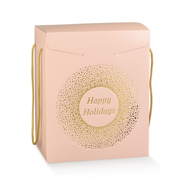 O cutie perfecta pentru orice ocazie si sezon, facuta din carton premium de culoare somon si auriu, cu manere textile.