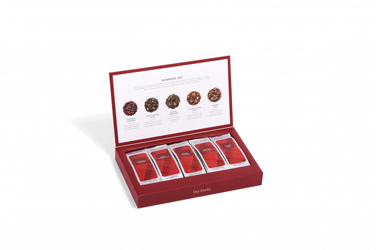 Sortimente de ceai incluse: Cherry Marzipan (ceai verde, fructe), Raspberry Ganache(ceai negru, zmeura, ciocolata), Sweet Orange Spice (ceai negru, portocale), Harvest Apple Spice (ceai din plante, fructe, mar), Winter Chai (rooibos, condimente)