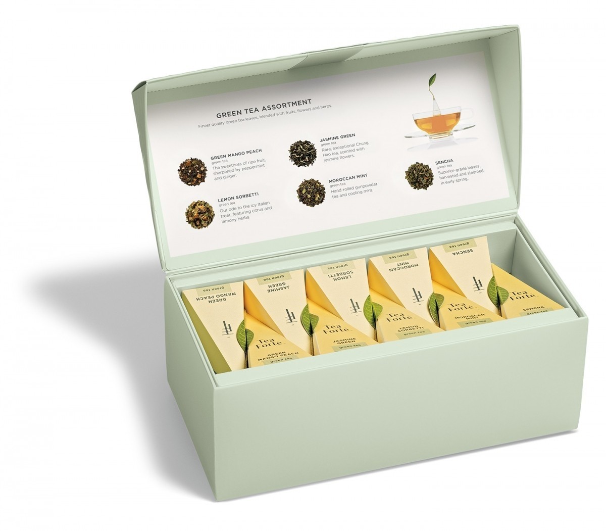 Ceaiurile verzi esentiale sunt cunoscute pentru beneficiile remarcabile si esentiale pentru sanatate pe care le poate aduce o ceasca zilnica. Fiecare cutie include cincisprezece pliculete de ceai verde in frunze vrac, cate trei dintre urmatoarele amestecuri de ceai verde: Green Mango Peach, Sencha, Moroccan Mint, Jasmine Green si Lemon Sorbetti.