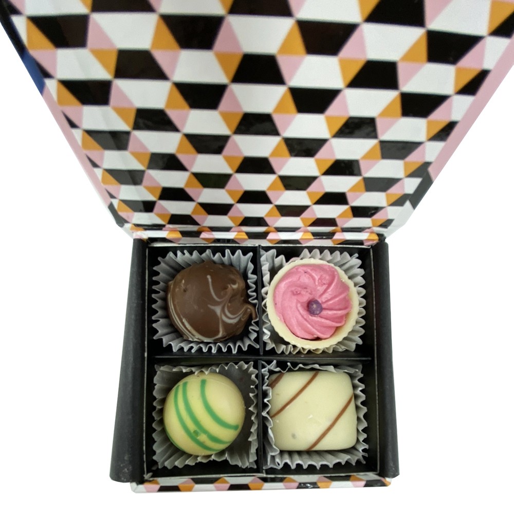O cutiuta eleganta cu 4 praline delicate, invelite in cea mai fina ciocolata si cu umpluturi care iau simturile prin suprindere. Produs in Belgia.
