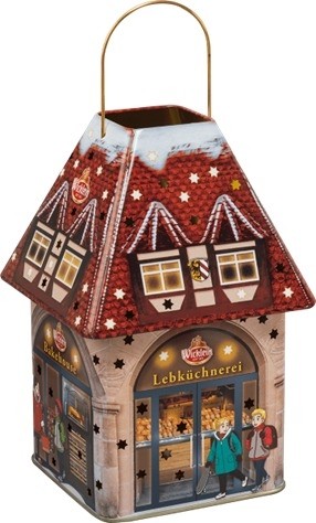Casuta metalica umpluta cu cea mai buna turta dulce cu glazura de zahar si ciocolata. Dupa inlaturarea acoperisului si savurarea delicioaselor bucati de turta dulce, poti folosi aceasta casuta drept felinar: plaseaza o lumanare inauntru si bucura-te de lumina discreta filtrata de micile ferestre. Turta dulce este un produs sezonier, poate fi achizitionat numai in perioada octombrie-ianuarie. | Produs in Germania.
