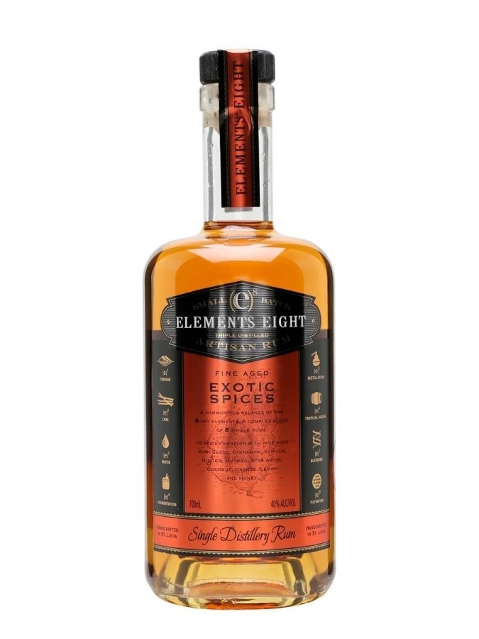ELEMENTS EIGHT SPICED cu condimente „Infuzate cu baril” este un rom amestecat minuÈ›ios, cu 10 fructe exotice. Acest proces este asemănător cu cel al diferitelor finisaje de baril văzute în lumea whisky-ului, unde amestecurile sunt maturate in butoaie de sherry, port È™i Madeira.