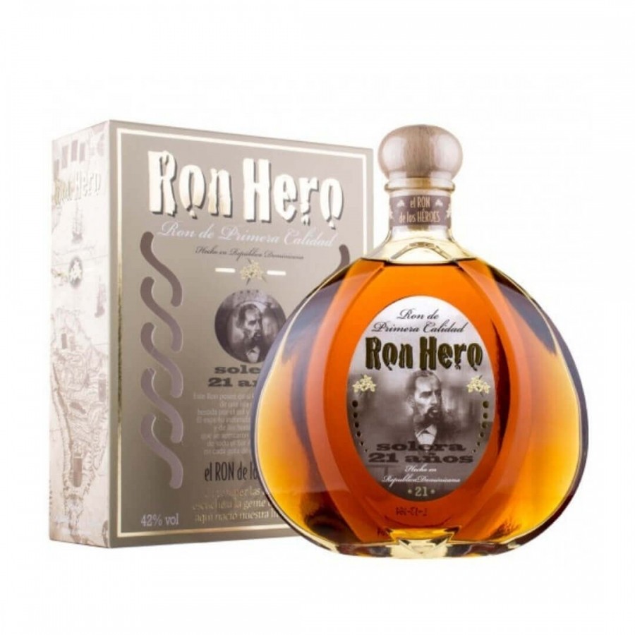 Rom Hero, de 21 de ani, provine din Republica Dominicană. Este obÈ›inut din trestie de zahăr prin metoda Solera, rezultând note bine rotunjite, suculente de fructe È™i ciocolată neagră, în complexitatea aromelor È™i a gustului. Rom Hero 12 ani este lasat la maturat în butoaie de stejar.