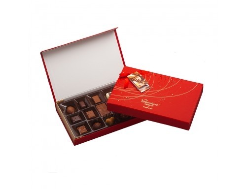 Un cadou bogat in ciocolata, la un pret convenabil. Este foarte potrivit si pentru evenimente, cand vrei sa iti servesti invitatii cu ceva bun si rafinat. Produs in Belgia. Aceasta cutie contine 12 praline belgiene Valentino.