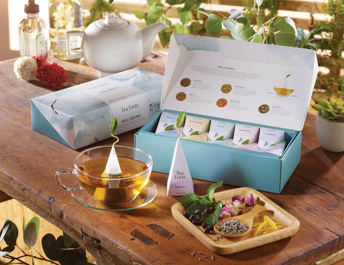 Cutia contine 10 de infuzoare de piramide, cate patru dintre urmatoarele amestecuri: Defense (ceai verde), Invigorate (ceai verde), Purify (ceai de plante), Radiance (ceai de plante) si Serenity (ceai de plante).