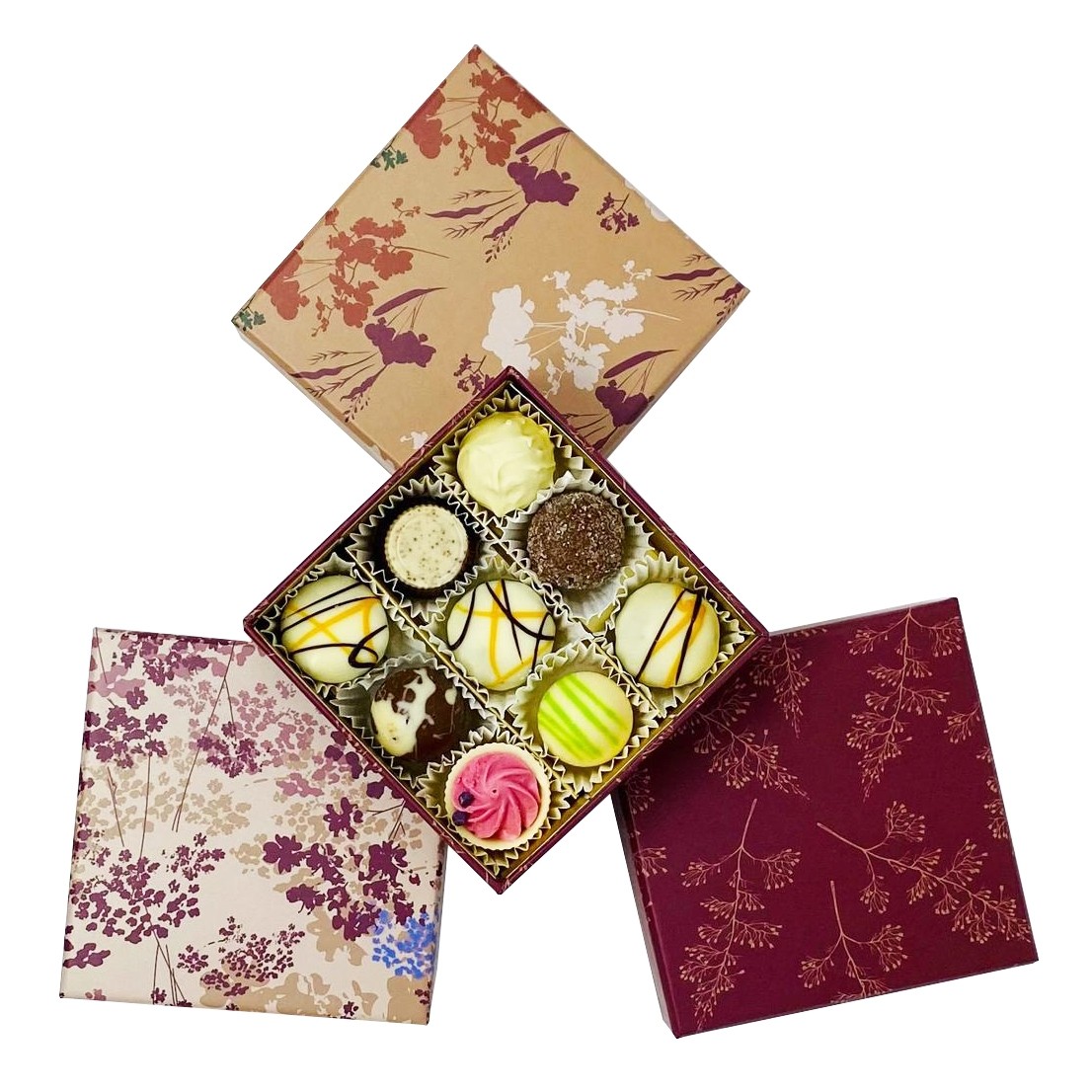 Cutie cu 9 praline de ciocolata belgiana Valentino. O colectie unica ce contine 3 modele de cutii.