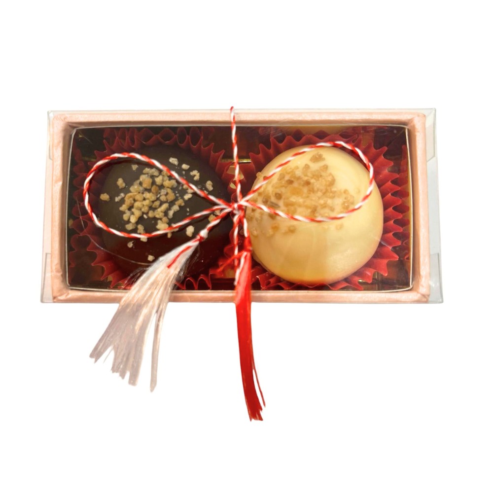 Cutie cu doua praline belgiene Valentino. Cel mai potrivit cadou cu ciocolata belgiana delicioasa pentru rasfatul personal. Ideal si pentru aniversare, ziua indragostitilor si 1 - 8 martie. Produs in Belgia.