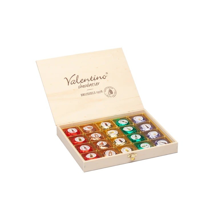 Cutie din lemn cu 20 praline din ciocolata neagra Valentino cu lichior.