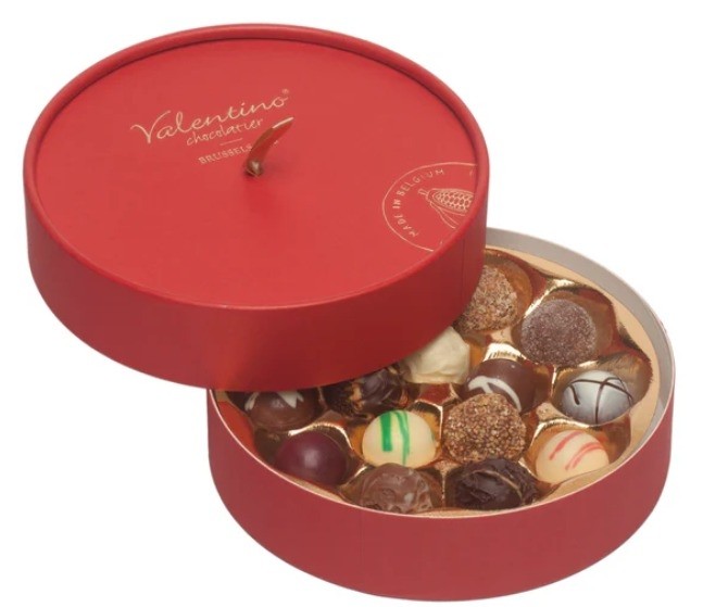 Cutie cu trufe delicioase cu crema de alune de padure, vanilie, caramel, cocos, cafea sau de ce nu putin alcool invelite in cea mai fina ciocolata Valentino. Produs in Belgia.