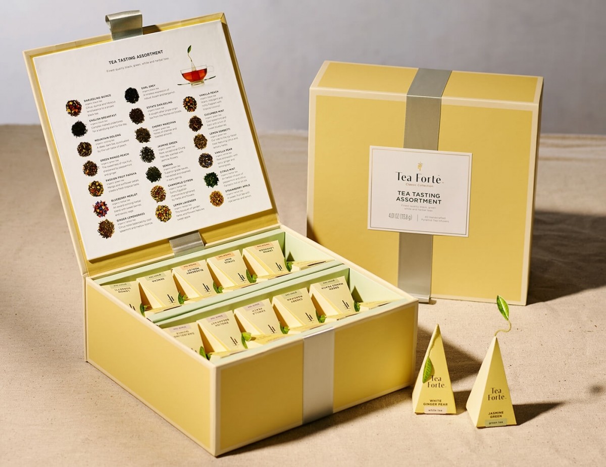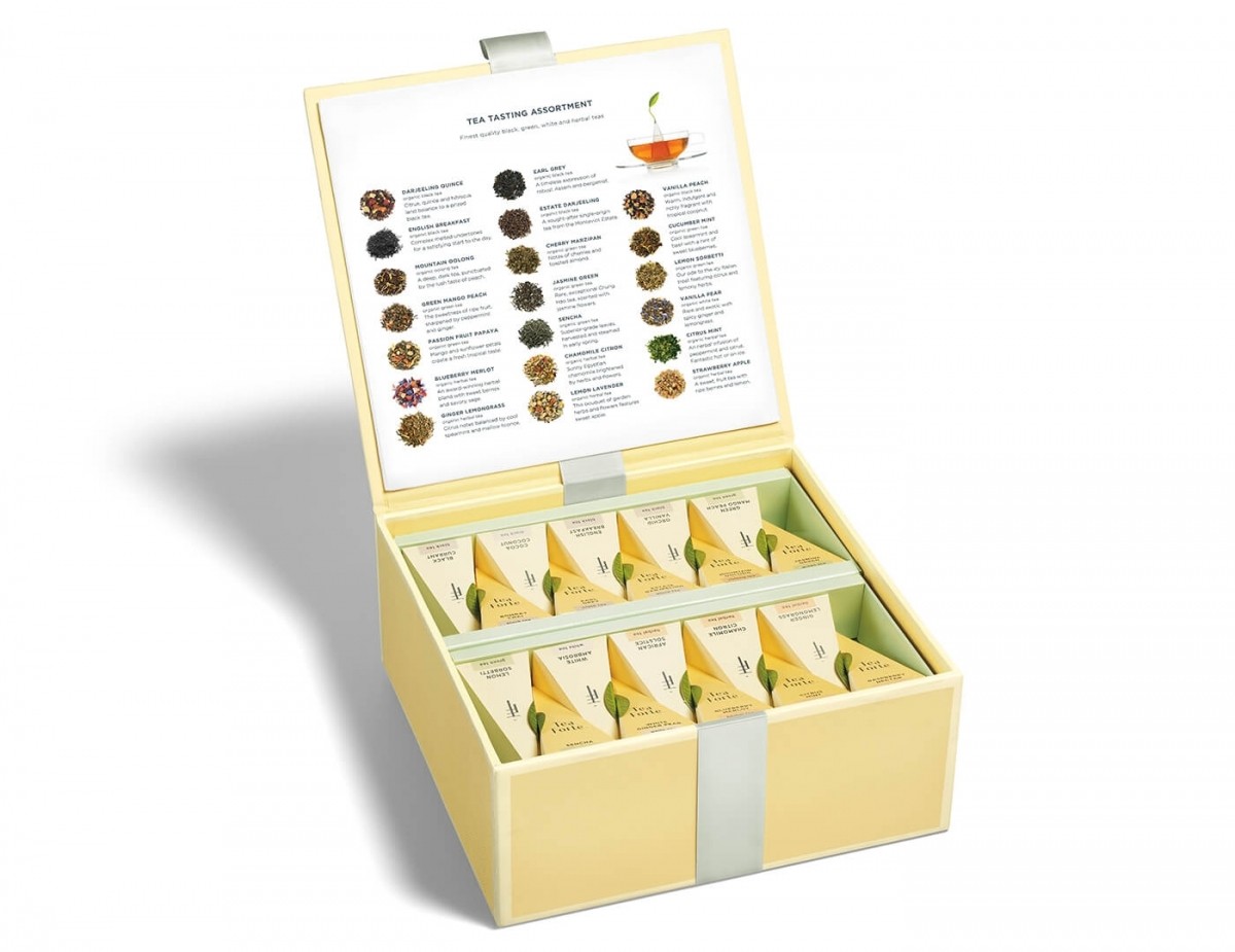 Sortimente de ceai incluse: Bombay Chai, Caramel Nougat, Darjeeling Quince, Earl Grey, English Breakfast, Estate Darjeeling, Orchid Vanilla, Mountain Oolong, Cherry Blossom, Cucumber Mint, Green Mango Peach, Jasmin Green, Lemon Sorbetti, Vanilla Pear, Blueberry Merlot, Chamomile Citron, Citrus Mint, Ginger Lemongrass, Hibiscus Blossom, Lemon Lavender.
